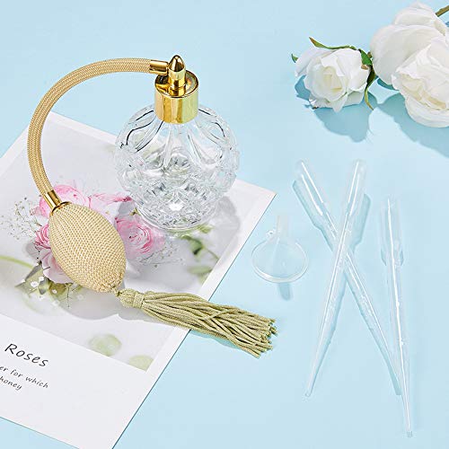 - ?¥ñ[PERFUME BOTTLES PACKAGE INCLUDE]: DIY perfume bottles kits with glass empty refillable perfume bottles, yellow long spray tassels atomizer pump, plastic funnel hopper & dropper with a white cardboard box. 1xSpray Bottle: capacity: 80ml; 1xFunnel Hopper: 37mm, hole: 2mm; 1xDropper: about 15.7cm, capacity: 3ml.